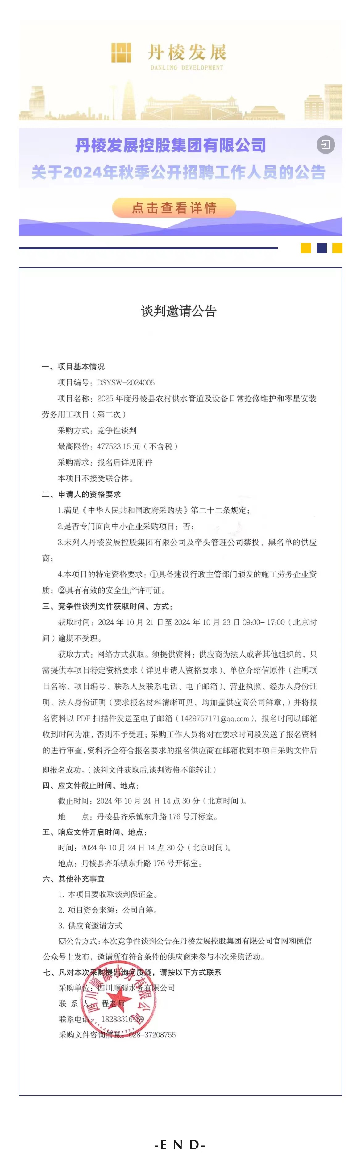 2025年度丹棱縣農(nóng)村供水管道及設(shè)備日常搶修維護(hù)和零星安裝勞務(wù)用工項(xiàng)目第二次談判邀請公告