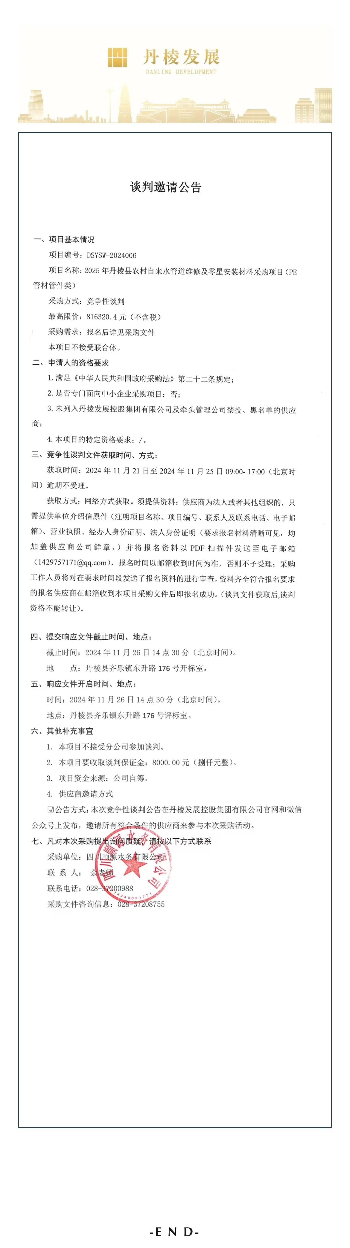 2025年丹棱縣農(nóng)村自來水管道維修及零星安裝材料采購項(xiàng)目(PE管材管件類)談判邀請公告