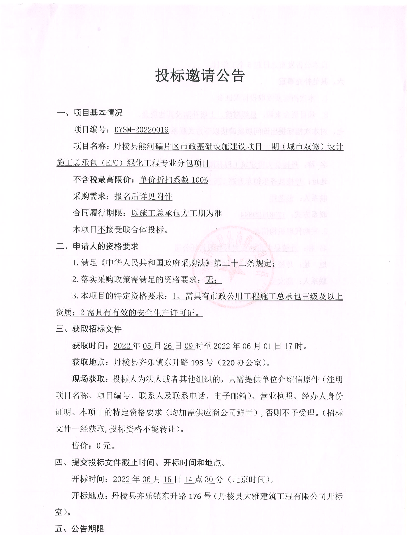 丹棱縣熊河碥片區(qū)市政基礎設施建設項目一期(城市雙修)設計施工總承包(EPC)綠化工程專業(yè)分包項目投標邀請公告
