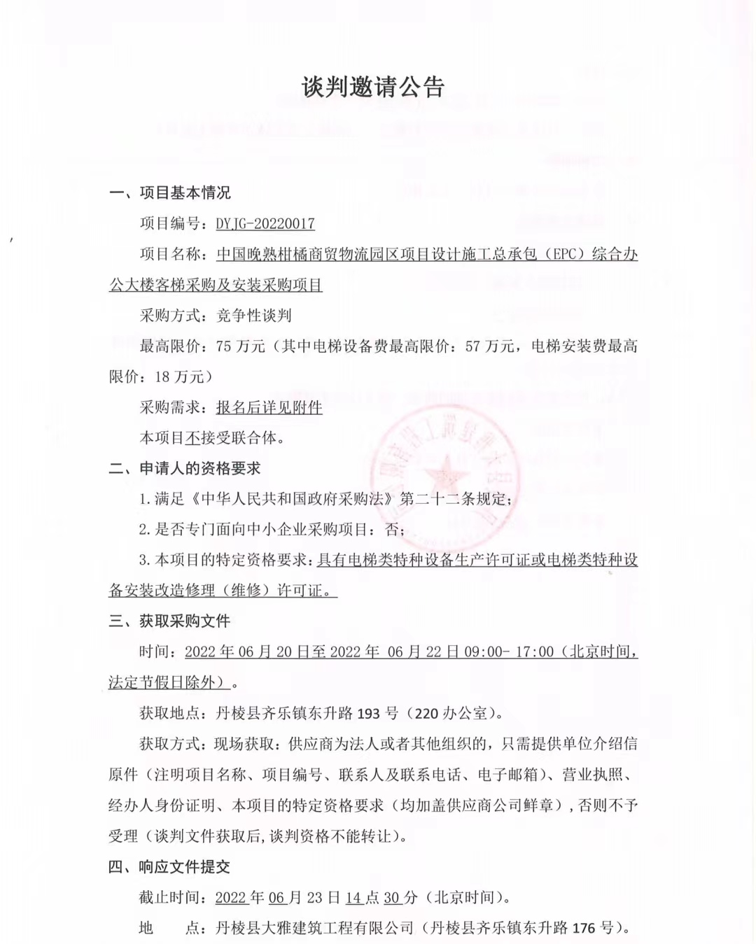中國(guó)晚熟柑橘商貿(mào)物流園區(qū)項(xiàng)目設(shè)計(jì)施工總承包(EPC)綜合辦公大樓客梯采購(gòu)及安裝采購(gòu)項(xiàng)目談判邀請(qǐng)公告