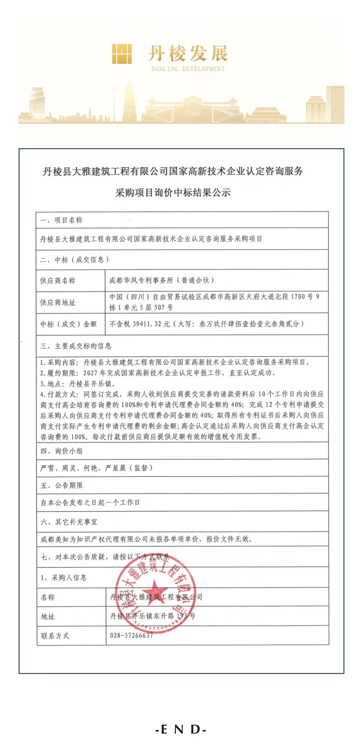 丹棱縣大雅建筑工程有限公司國(guó)家高新技術(shù)企業(yè)認(rèn)定咨詢服務(wù)采購(gòu)項(xiàng)目詢價(jià)中標(biāo)結(jié)果公示