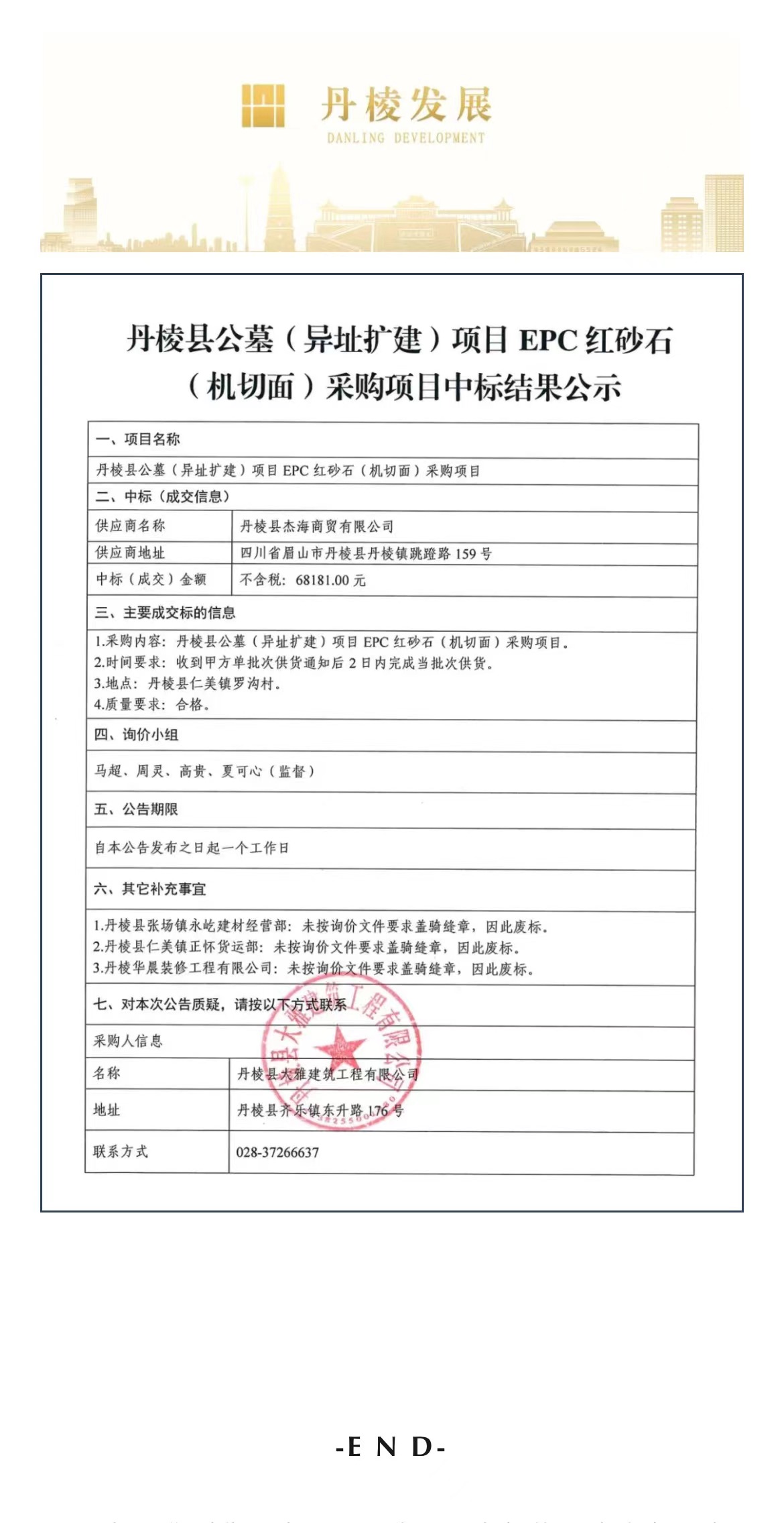 丹棱縣公墓(異址擴(kuò)建)項(xiàng)目EPC紅砂石(機(jī)切面)采購(gòu)項(xiàng)目中標(biāo)結(jié)果公示