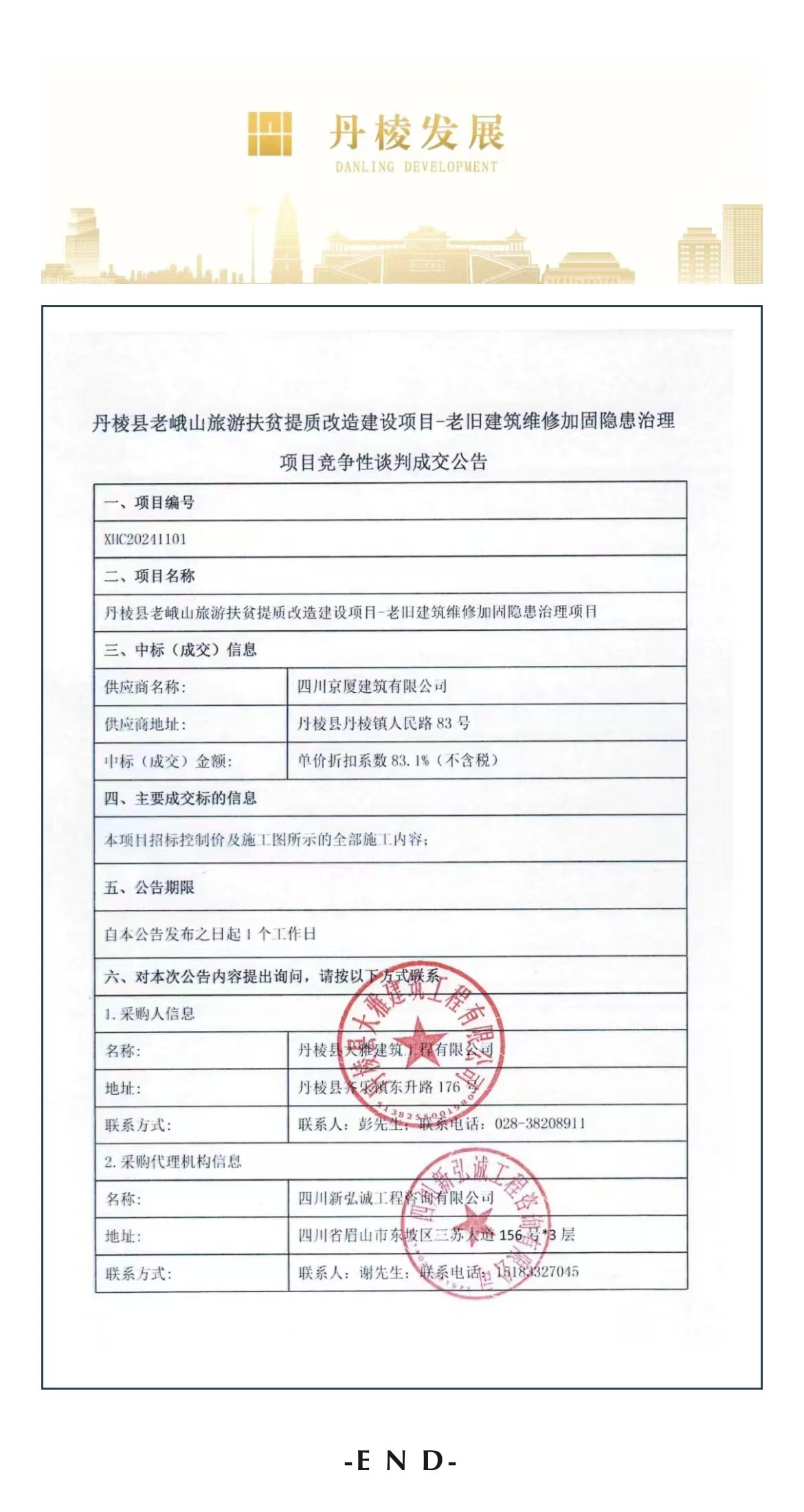 丹棱縣老峨山旅游扶貧提質(zhì)改造建設(shè)項(xiàng)目——老舊建筑維修加固隱患治理項(xiàng)目競(jìng)爭(zhēng)性談判成交公告