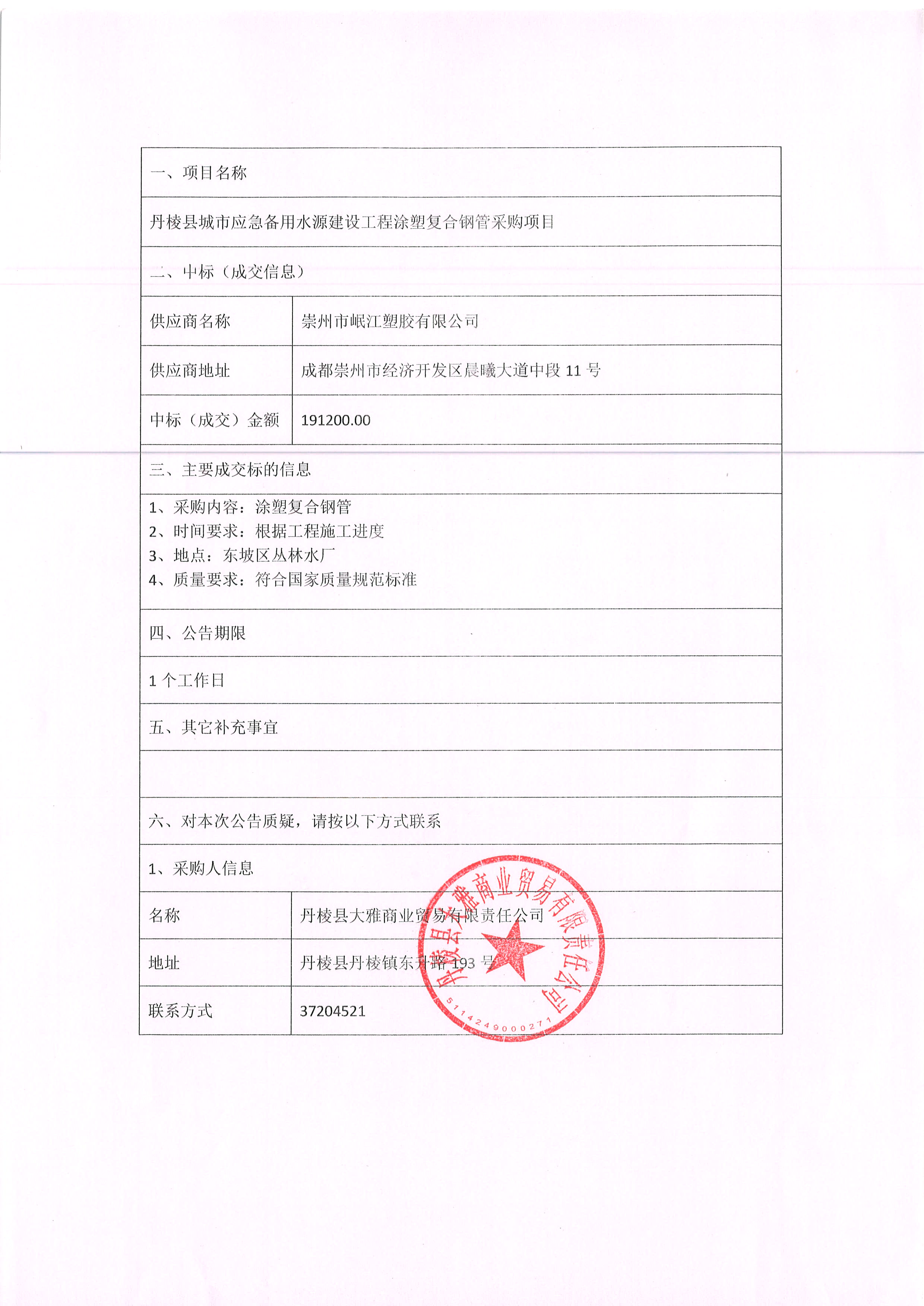 【大雅商貿(mào)公司】丹棱縣城市應(yīng)急備用水源建設(shè)工程涂塑復(fù)合鋼管采購項目中標(biāo)結(jié)果公示