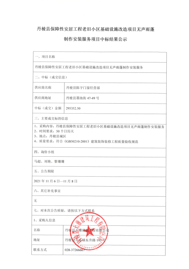【大雅建筑公司】丹棱縣保障性安居工程老舊小區(qū)基礎(chǔ)設(shè)施改造項目無聲雨蓬制作安裝服務(wù)項目中標結(jié)果公示