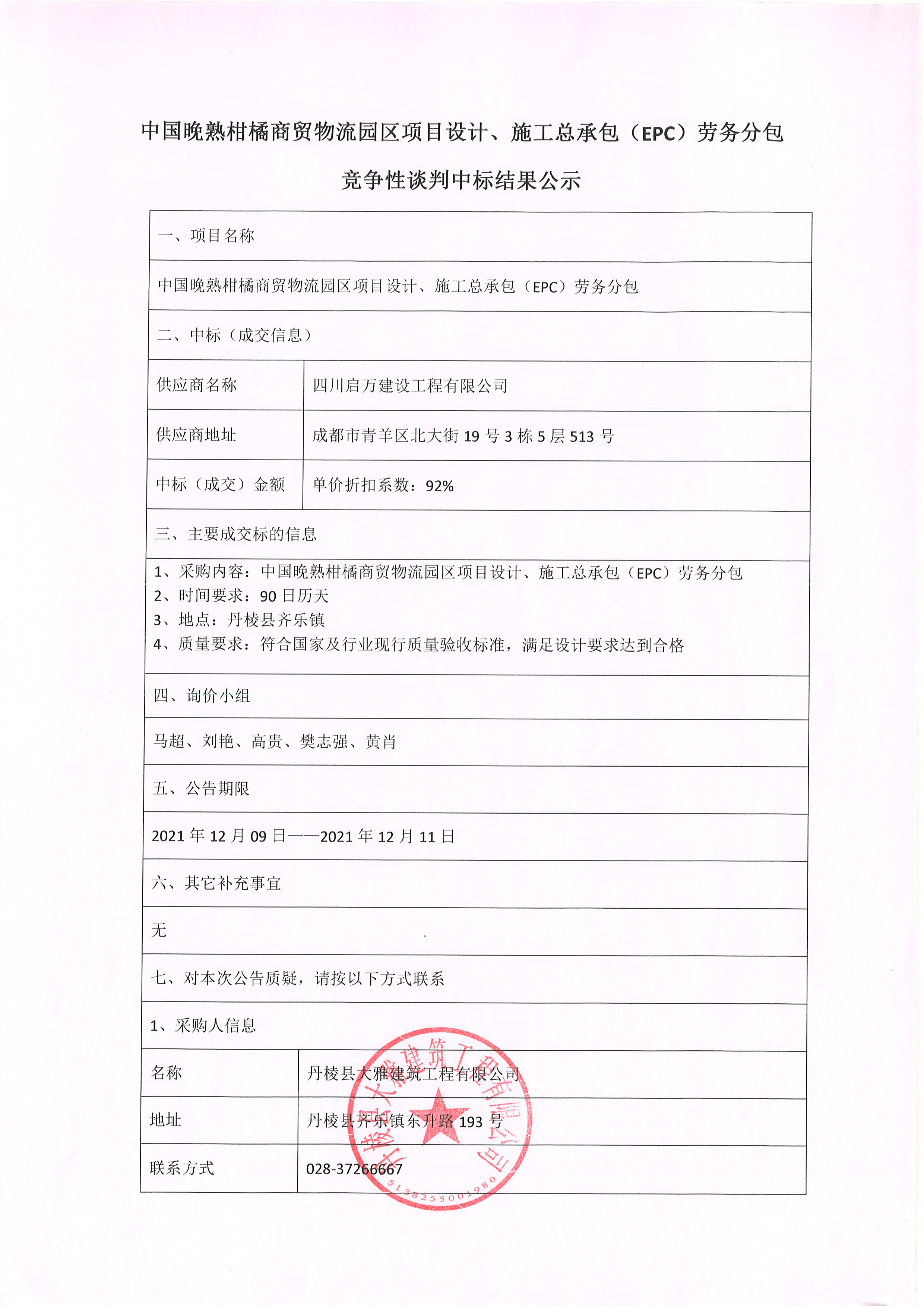 【大雅建筑公司】中國晚熟柑橘商貿物流園區(qū)項目設計、施工總承包(EPC)勞務分包競爭性談判中標結果公示