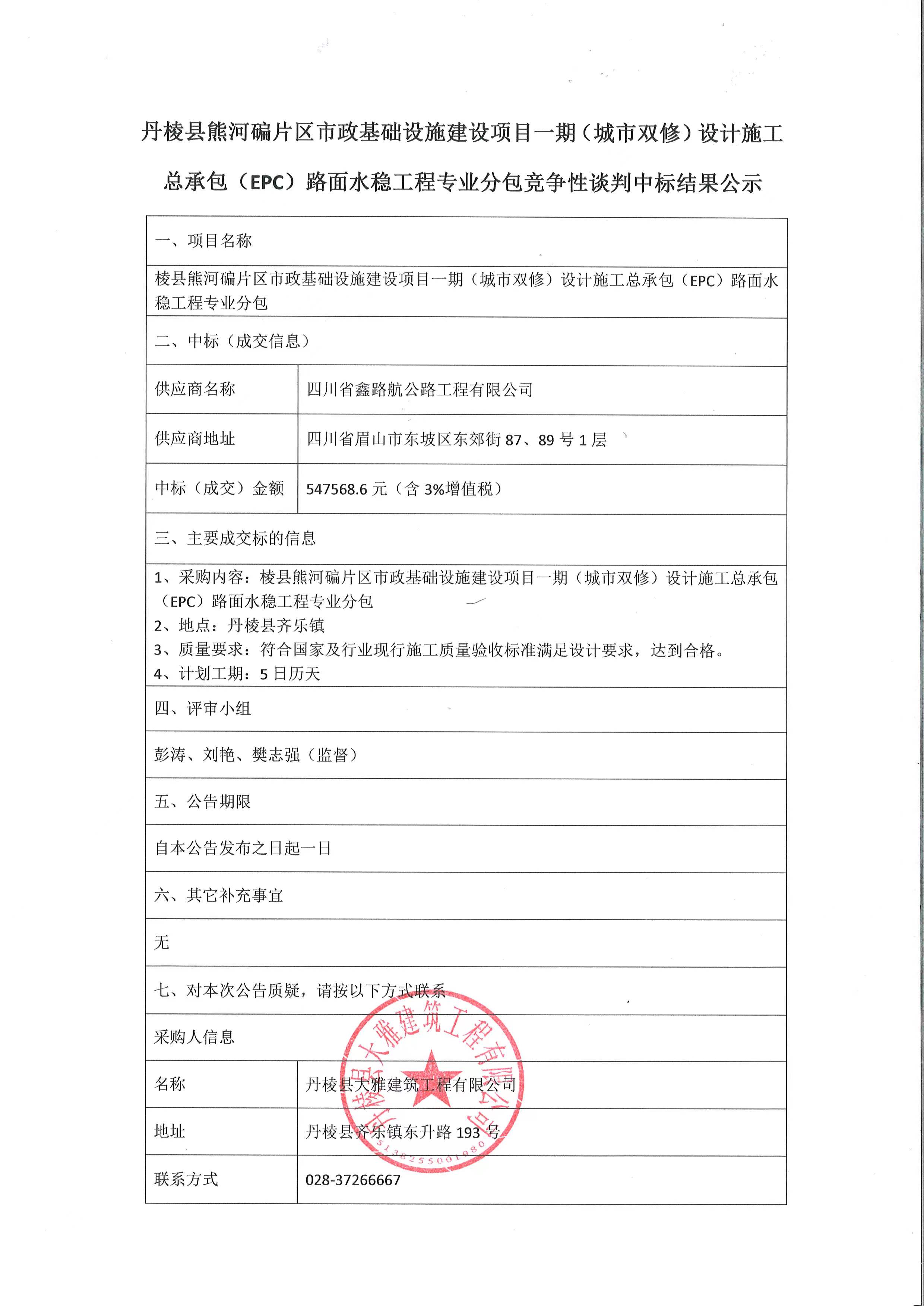 丹棱縣熊河碥片區(qū)市政基礎(chǔ)設(shè)施建設(shè)項(xiàng)目一期(城市雙修)設(shè)計(jì)施工總承包(EPC)路面水穩(wěn)工程專業(yè)分包競爭性談判中標(biāo)結(jié)果公示