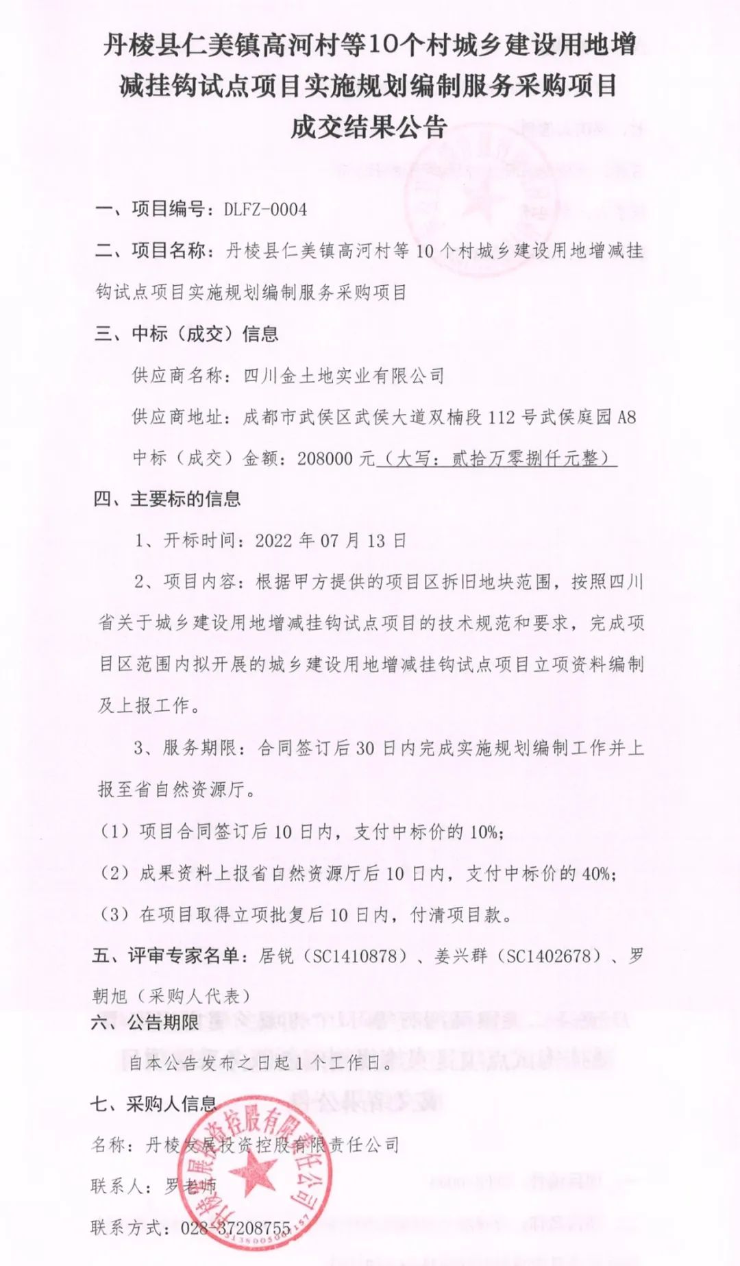 丹棱縣仁美鎮(zhèn)高河村等10個(gè)村城鄉(xiāng)建設(shè)用地增減掛鉤試點(diǎn)項(xiàng)目實(shí)施規(guī)劃編制服務(wù)采購(gòu)項(xiàng)目成交結(jié)果公告