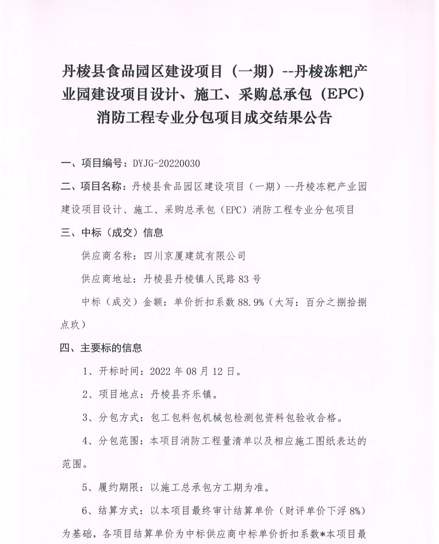 丹棱縣食品園區(qū)建設項目(一期)--丹棱凍粑產業(yè)園建設項目設計、施工、采購總承包(EPC)消防工程專業(yè)分包項目成交結果公告