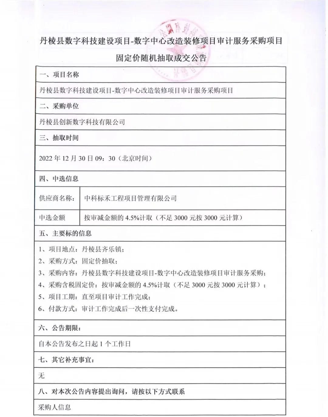 丹棱縣數(shù)字科技建設(shè)項(xiàng)目-數(shù)字中心改造裝修項(xiàng)目審計(jì)服務(wù)采購項(xiàng)目固定價(jià)隨機(jī)抽取成交公告