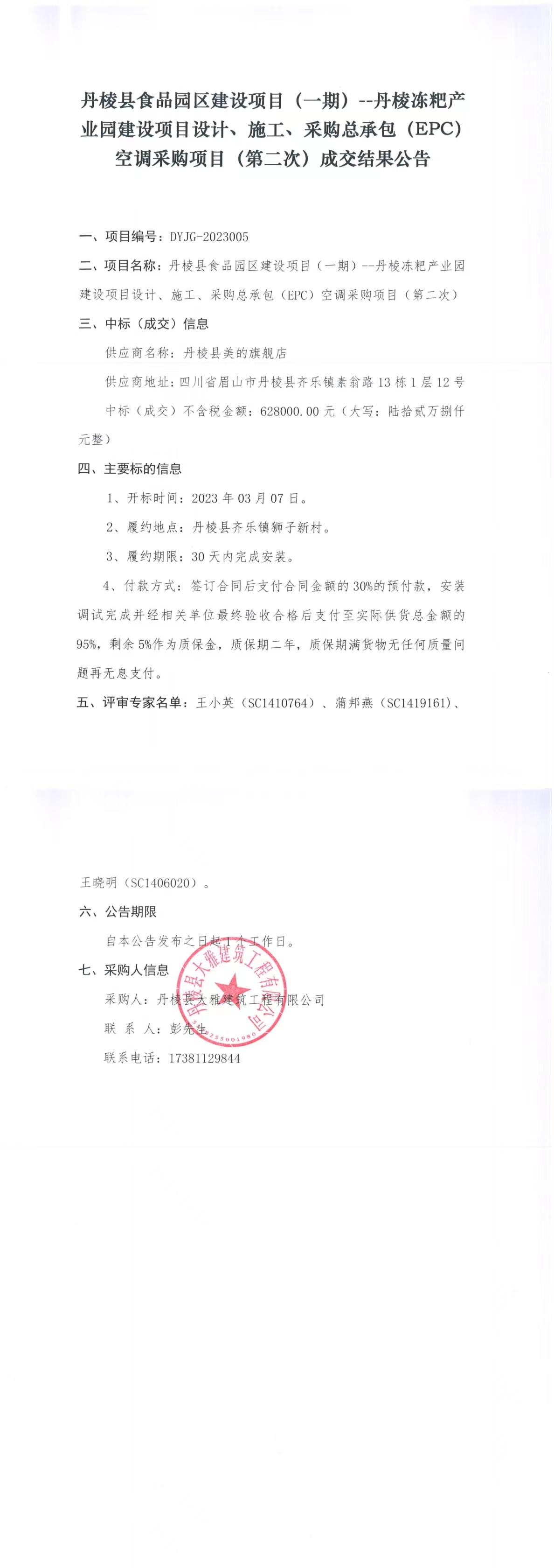 丹棱縣食品園區(qū)建設(shè)項(xiàng)目(一期)--丹棱凍粑產(chǎn)業(yè)園建設(shè)項(xiàng)目設(shè)計(jì)、施工、采購(gòu)總承包(EPC)空調(diào)采購(gòu)項(xiàng)目(第二次)成交結(jié)果公告