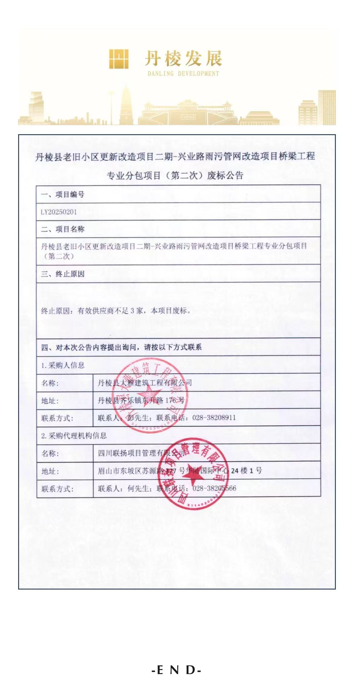 丹棱縣老舊小區(qū)更新改造項目二期-興業(yè)路雨污管網改造項目橋梁工程專業(yè)分包項目(第二次)廢標公告