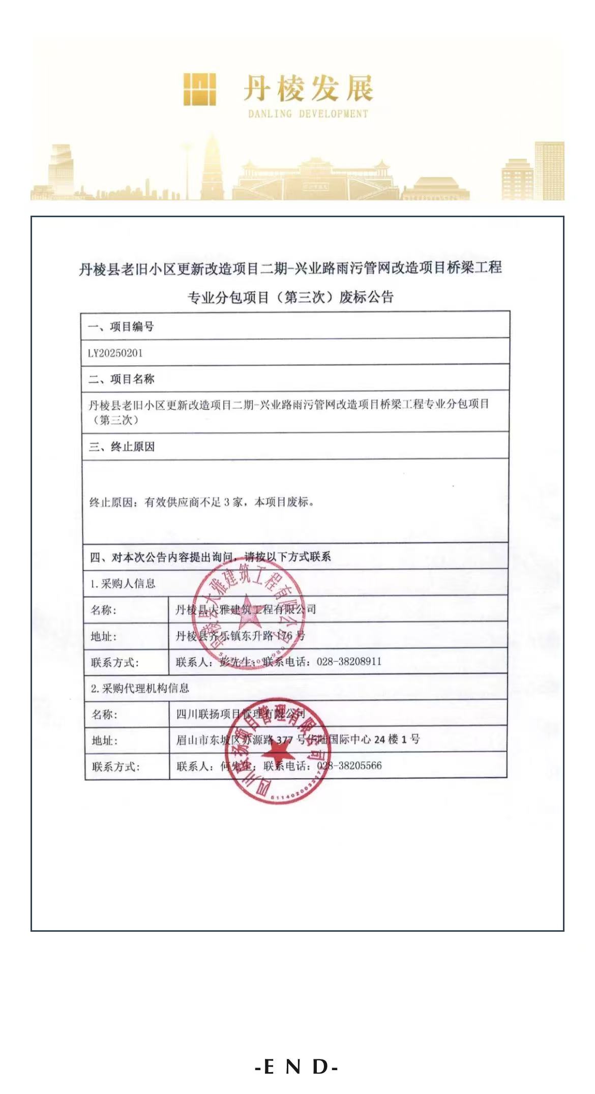 丹棱縣老舊小區(qū)更新改造項目二期-興業(yè)路雨污管網(wǎng)改造項目橋梁工程專業(yè)分包項目(第三次)廢標(biāo)公告