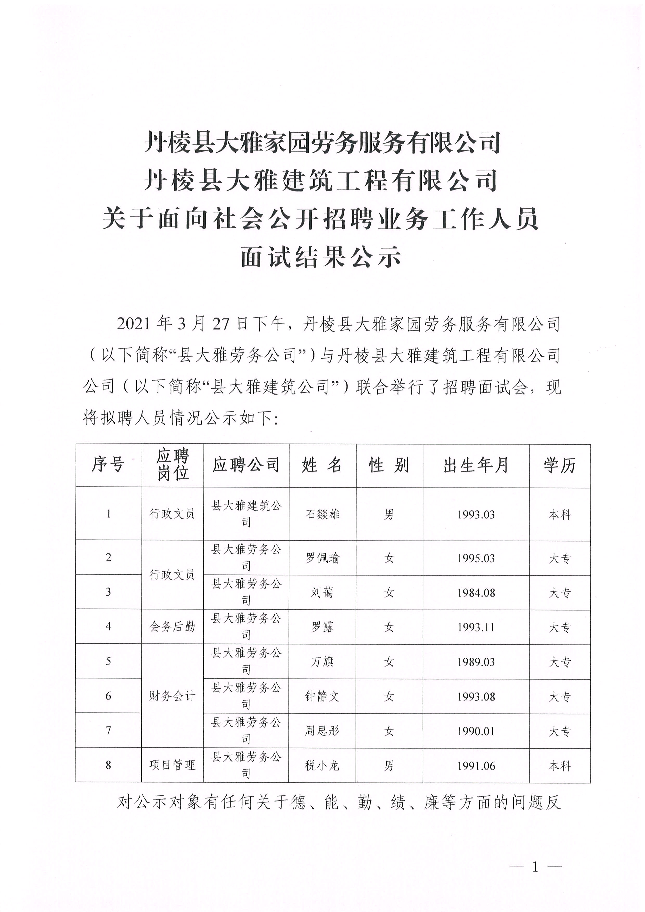 【大雅勞務(wù)公司】【大雅建筑公司】關(guān)于面向社會公開招聘業(yè)務(wù)工作人員 面試結(jié)果公示