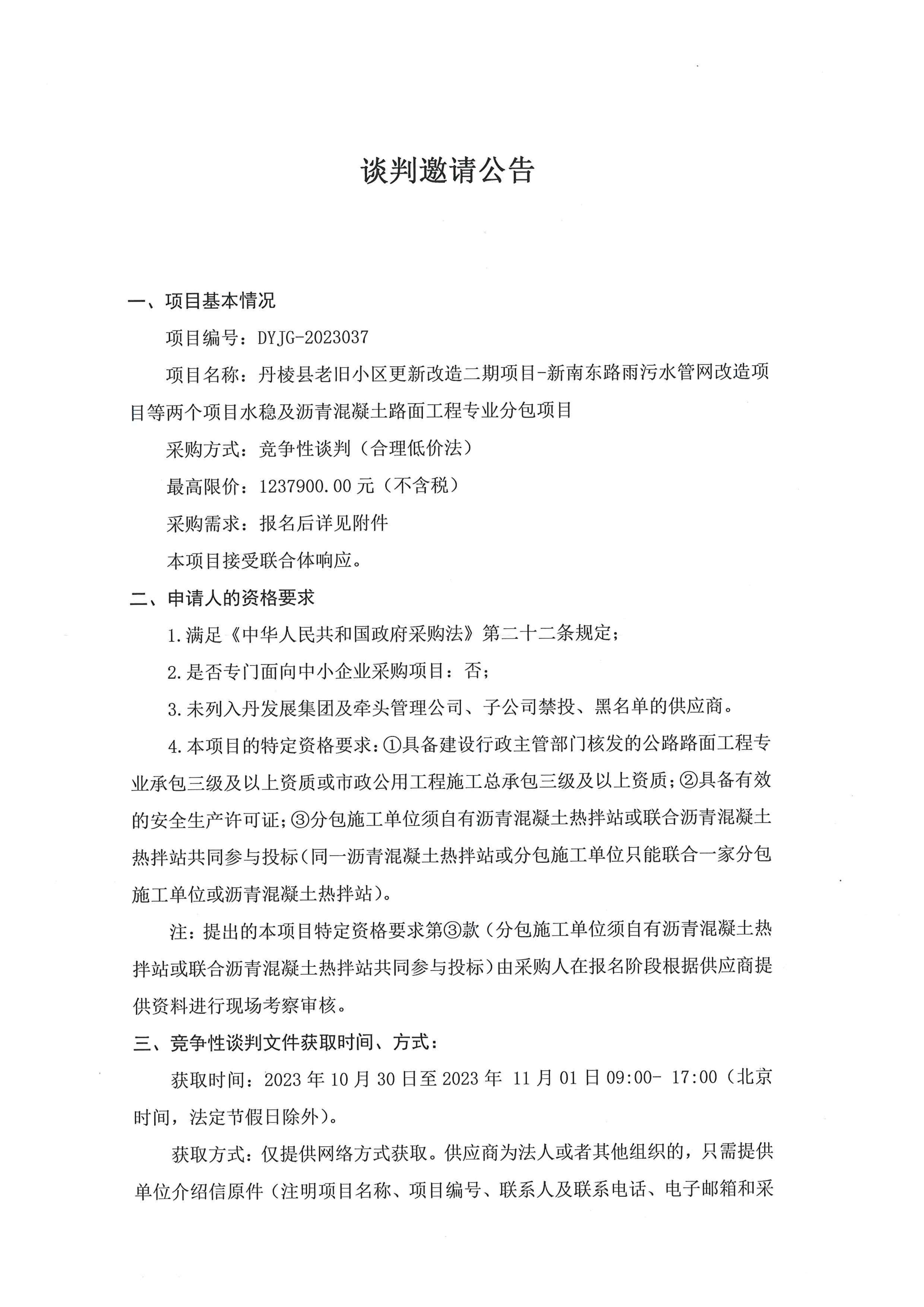 丹棱縣老舊小區(qū)更新改造二期項(xiàng)目-新南東路雨污水管網(wǎng)改造項(xiàng)目等兩個(gè)項(xiàng)目水穩(wěn)及瀝青混凝土路面工程專業(yè)分包項(xiàng)目談判邀請(qǐng)公告