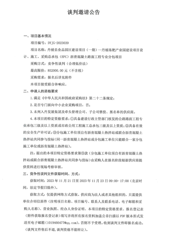 丹棱縣食品園區(qū)建設項目(一期)—丹棱凍粑產業(yè)園建設項目設計、施工、采購總承包(EPC)瀝青混凝土路面工程專業(yè)分包項目談判邀請公告