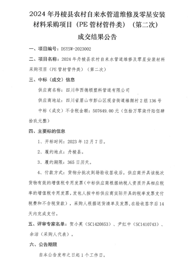 2024年丹棱縣農(nóng)村自來水管道維修及零星安裝材料采購(gòu)項(xiàng)目(PE管材管件類)(第二次)成交結(jié)果公告