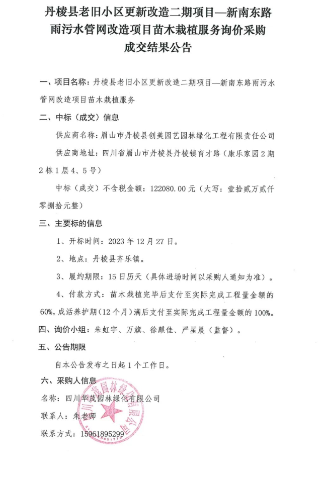 丹棱縣老舊小區(qū)更新改造二期項(xiàng)目——新南東路雨污水管網(wǎng)改造項(xiàng)目苗木栽植服務(wù)詢價(jià)采購(gòu)成交結(jié)果公告