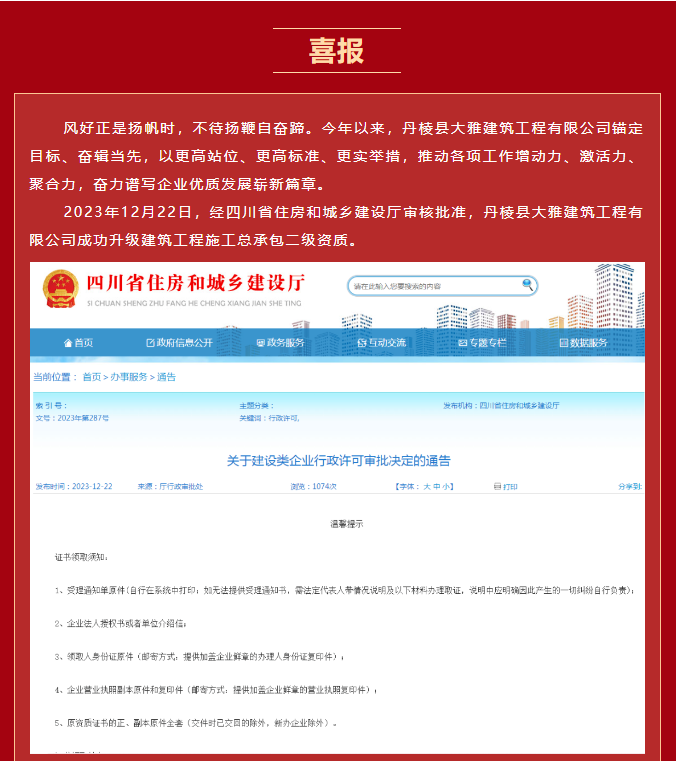 【縣大雅建筑公司】喜報!成功升級“建筑工程施工總承包二級”資質!