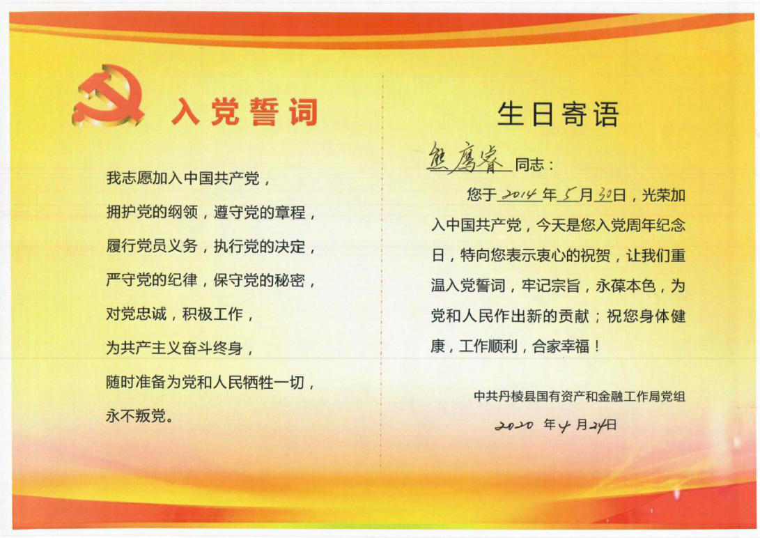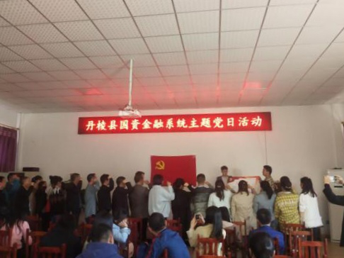 工作安排后,縣國資金融局黨組集體為5月入黨黨員過政治生日,縣國資金融局(縣金融服務(wù)中心)副主任茍永慶同志為“過生日”的黨員們送上精心制作的“黨員政治生日卡”,勉勵(lì)黨員同志要“常思入黨初衷、銘記入黨誓詞、牢記黨員義務(wù)”,發(fā)揮黨員先鋒模范作用,在今后的工作中不斷創(chuàng)先爭優(yōu),做好表率;顒(dòng)最后,全體黨員同志在縣國資金融局黨組成員、副局長潘國榮同志的帶領(lǐng)下重溫入黨誓詞、面對(duì)黨旗莊嚴(yán)宣誓。